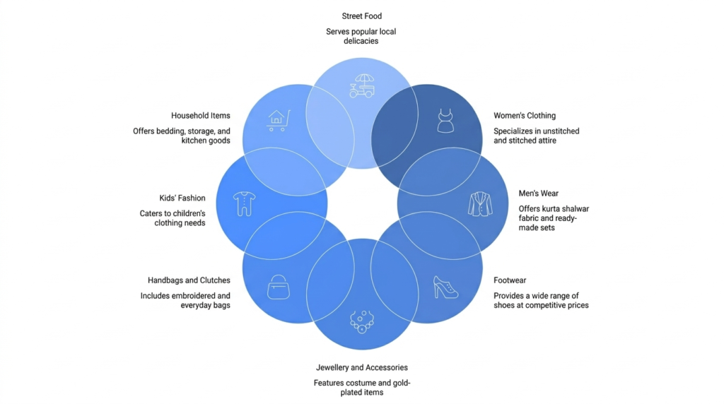Ichhra Bazaar’s market identity is built around three attributes that distinguish it from every other major Lahore bazaar: price accessibility, product concentration, and fabric variety. Unlike Hall Road (electronics) or Kasera Bazaar (antiques), Ichhra Bazaar is a fashion-first market the overwhelming majority of its shops deal in clothing, fabric, footwear, and accessories. This single-category concentration means that vendor competition within Ichhra Bazaar drives prices down continuously: two shops selling the same unstitched khaddar suit on the same lane creates price pressure that ultimately benefits the buyer. This competitive pricing dynamic, sustained across 2,000-plus vendors, is the structural reason Ichhra Bazaar consistently undercuts Liberty Market and Anarkali on equivalent goods.
