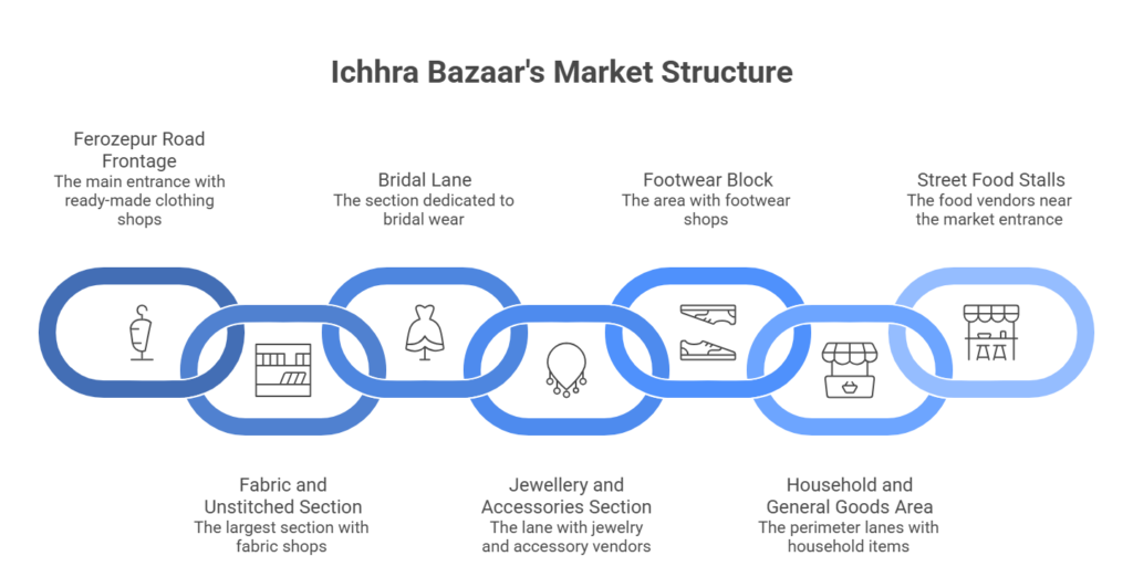 Ichhra Bazaar is not a single street it is a network of interconnected lanes, each with a dominant product category, that extends from the main Ferozepur Road frontage inward through multiple residential and commercial blocks. Understanding this layout before visiting significantly reduces shopping time and prevents the common mistake of missing entire sections because they are not visible from the main road.