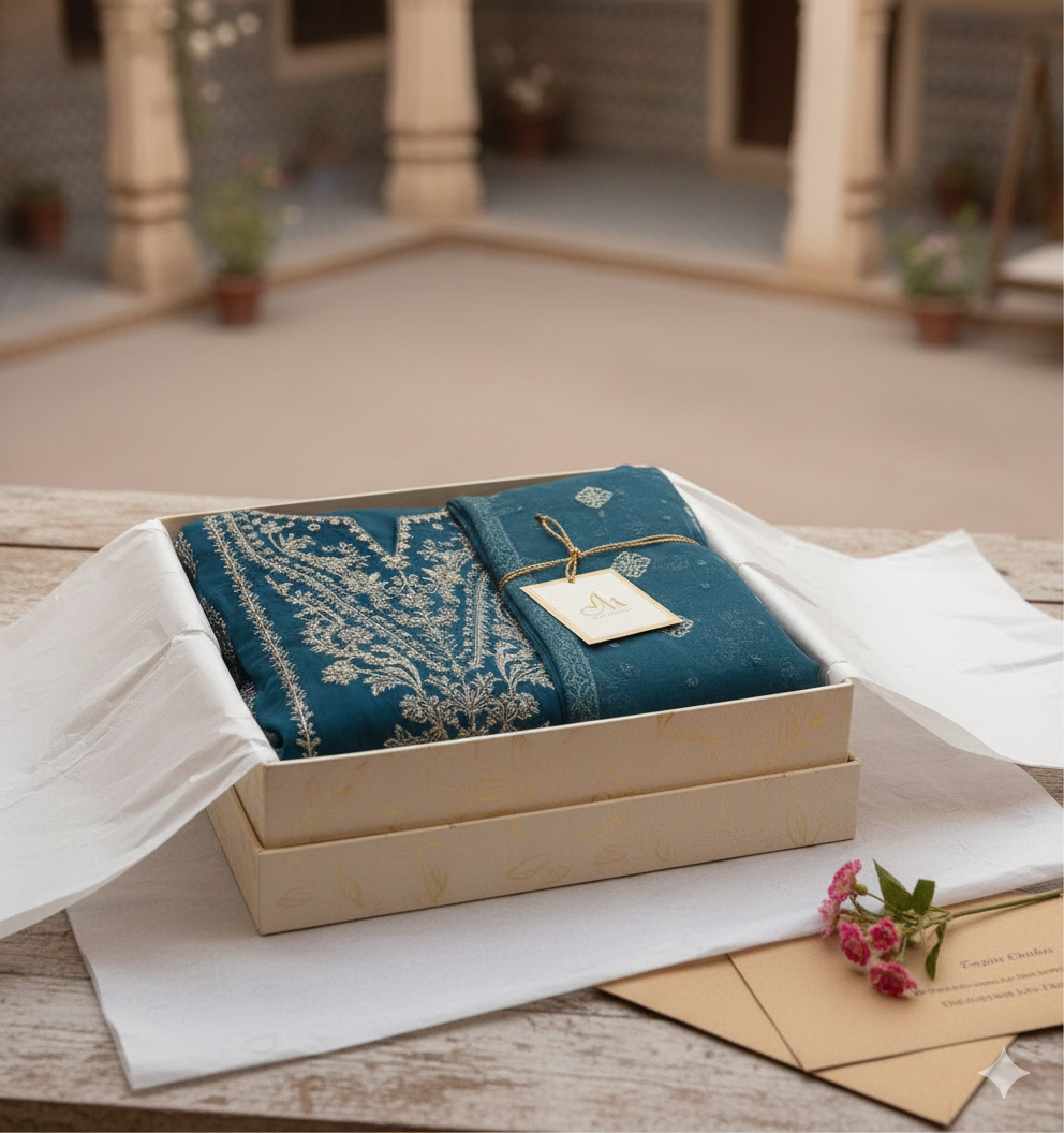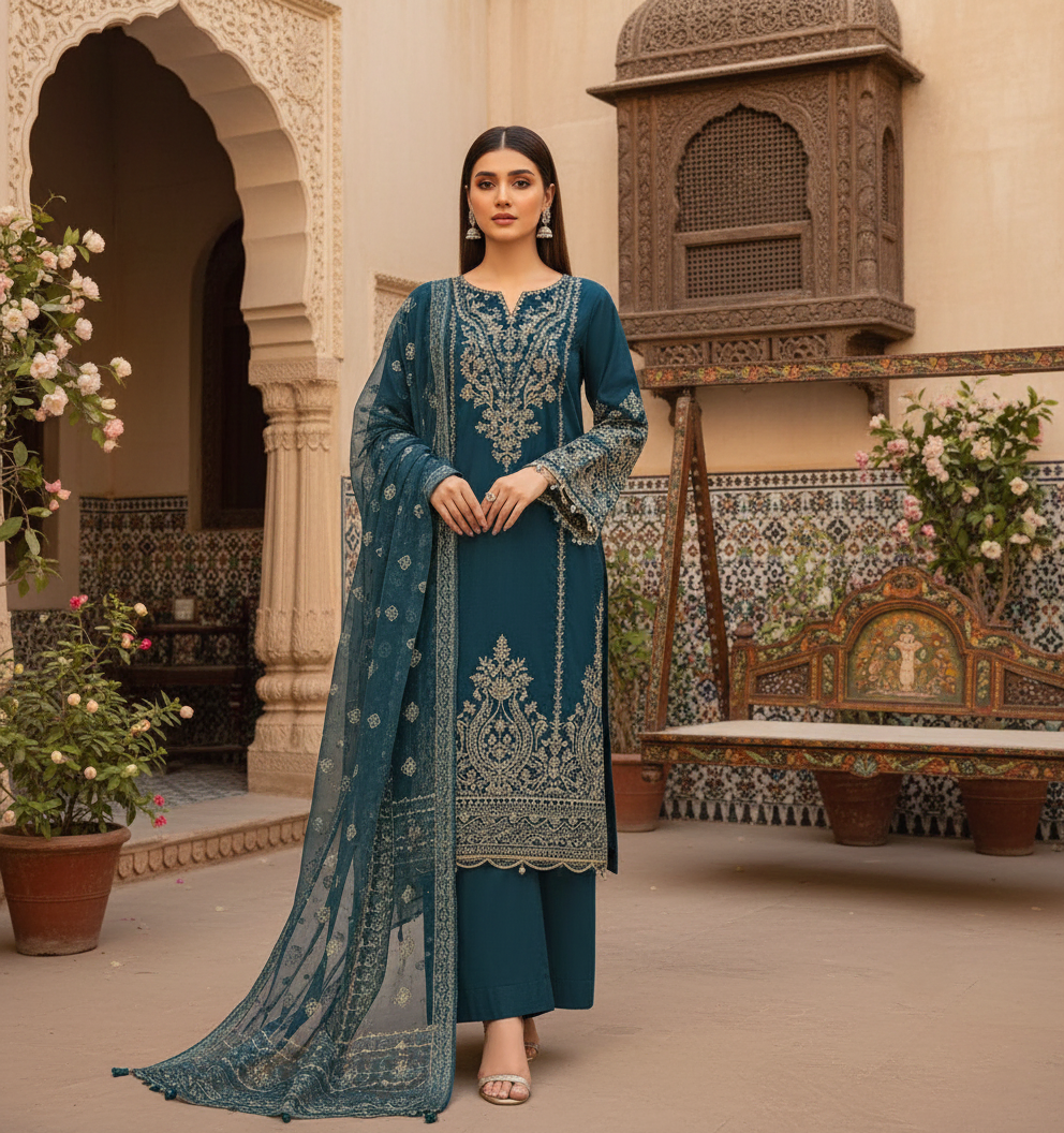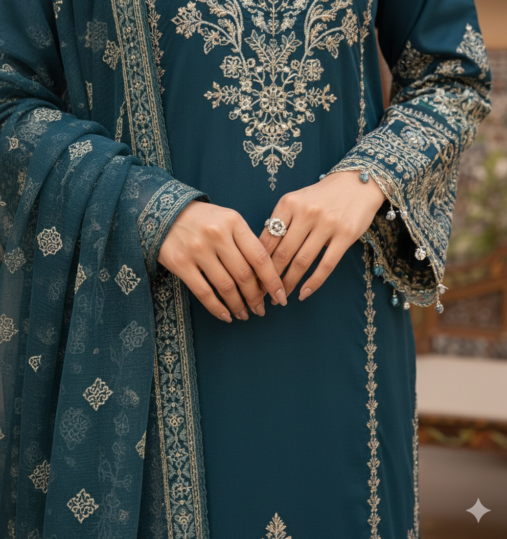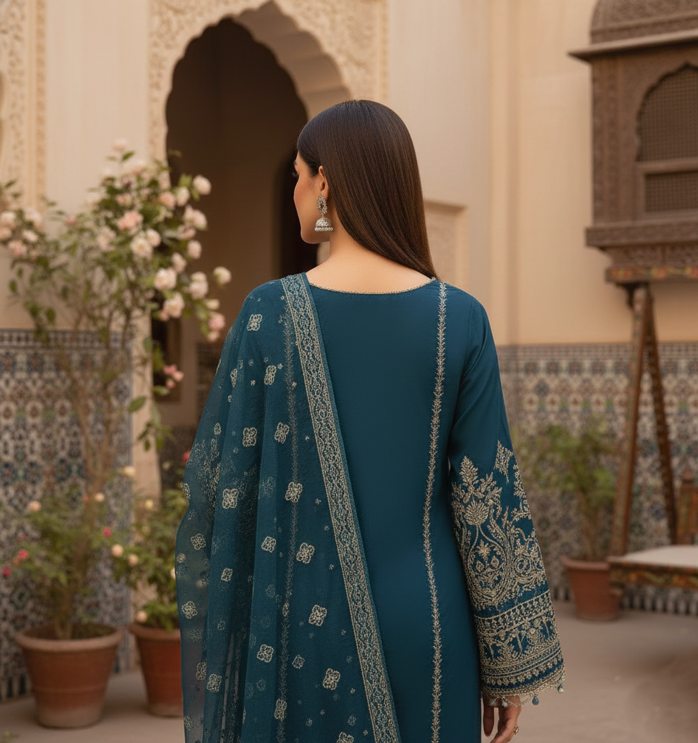 The Dupatta: The set is completed with a lovely, flowing chiffon dupatta in the same deep teal. It has subtle embroidery on the borders, making it light and elegant to carry.